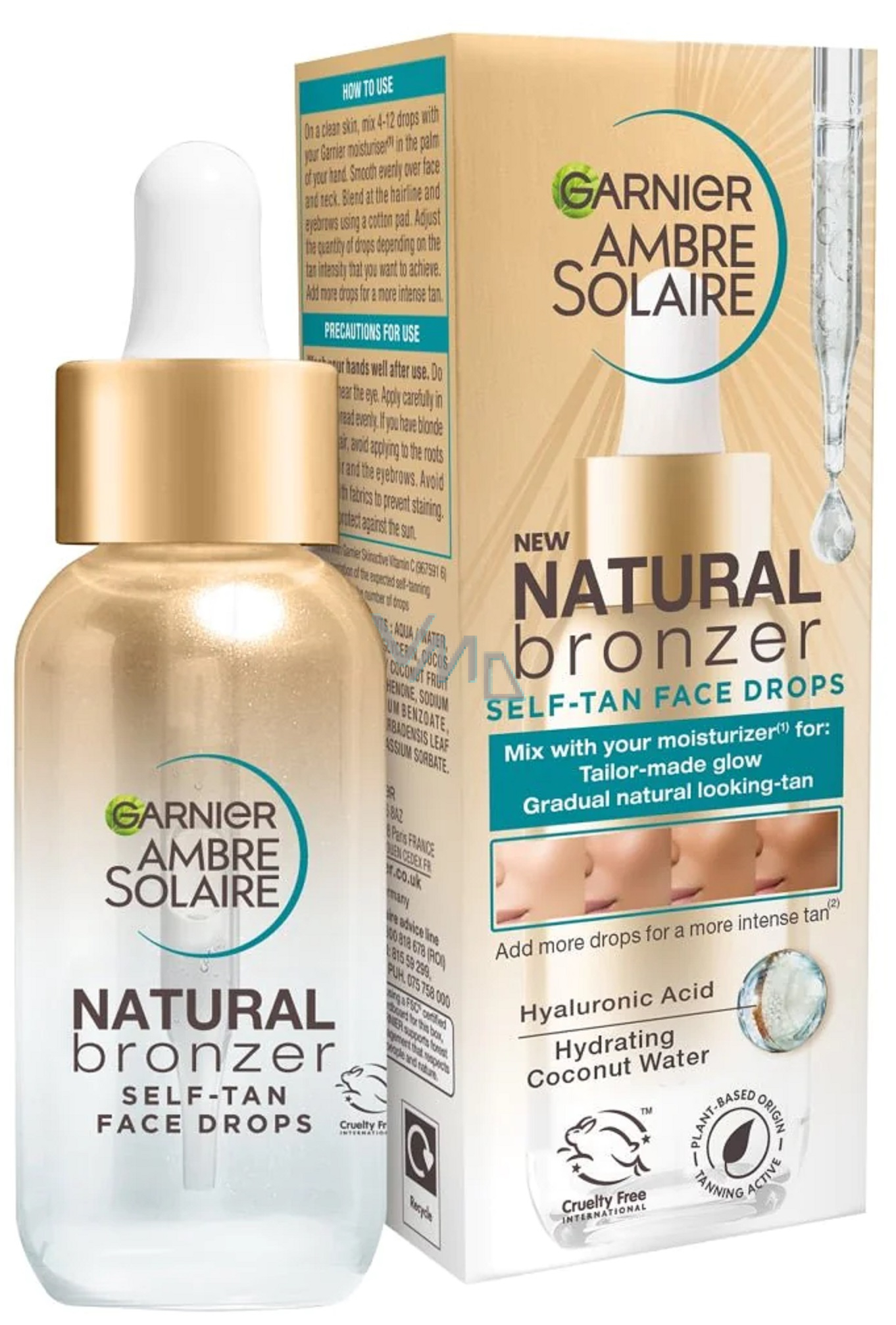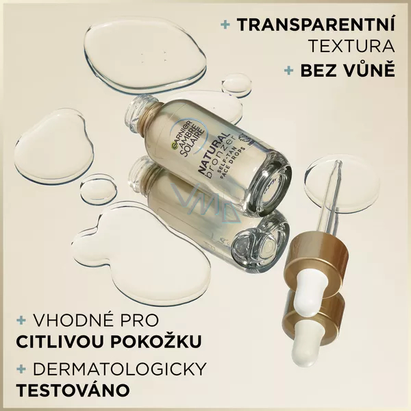 Samoopalovací kapky na obličej Natural Bronzer Garnier Ambre Solaire dodają skórze naturalnie opalony wygląd i zawarte roślinne ekstrakty dodają piękny zdrowy blask. Skład wzbogacony o kwas hialuronowy i wodę kokosową skórę nawilża, stopniowe dawkowanie kropli do nawilżającego kremu zapewni pożądany odcień opalenizny od delikatnego aż po brązowy. Zafunduj sobie naturalnie opaloną skórę bez smug.