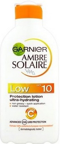 Nízká ochrana OF 10 Snědá pokožka. Odolná ochrana proti UVA/UVB. Složení obohacené o vitamin C při pravidelném používání dlouhodobě posilňuje přirozenou ochranu proti sluncem vyvolaným poškozením kůže. Hydratuje a chrání pokožku před vysušováním. Mléka mají nemastné voděodolné složení, rychle se vstřebávají.