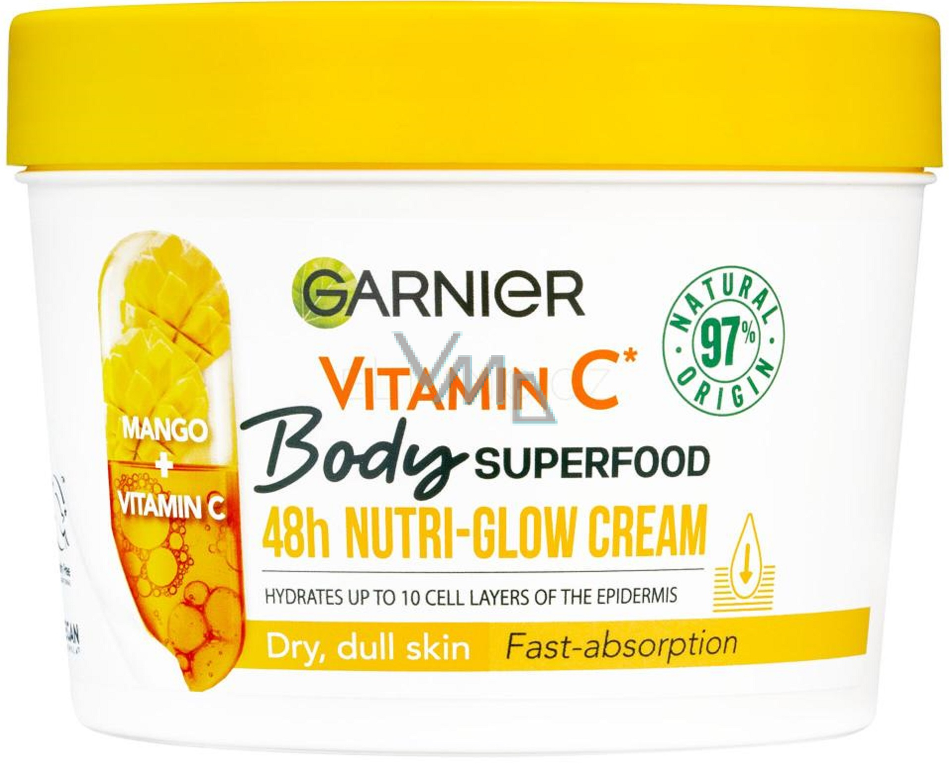 Krem do ciała Garnier Body Superfood Nutri Glow, bogaty w składniki odżywcze, intensywnie nawilża i odżywia suchą skórę przez 48 godzin trwałego nawilżenia. Dzięki mieszance superfoods witaminy C i ekstraktu z mango skuteczne składniki natychmiast wchłaniają się i pozostawiają skórę jedwabiście gładką i elastyczną. Krem, który jest gospodarzem szeregu właściwości rozjaśniających, wspiera rozświetlenie wewnętrzne od końcówek do pięt.