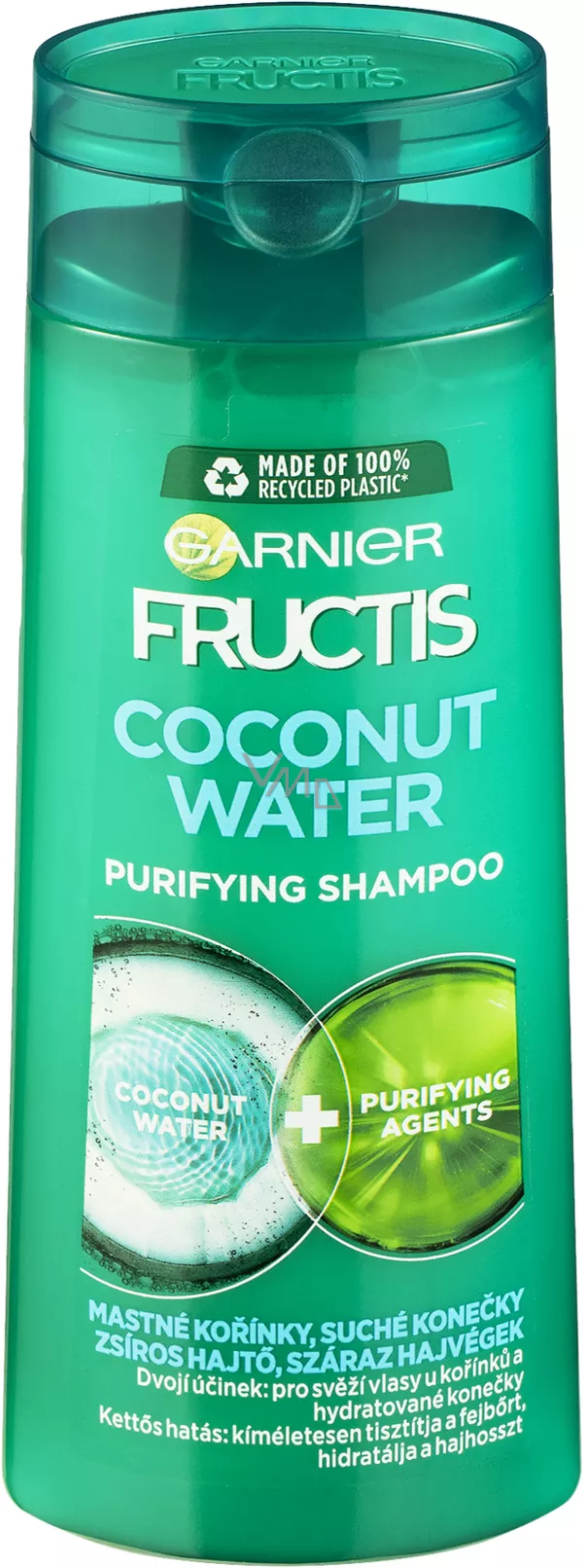 Fructis Woda kokosowa łączy w swoim składzie wodę kokosową i składniki oczyszczające w celu wzmocnienia i oczyszczenia włosów, skóry głowy, a jednocześnie nawilża końcówki.