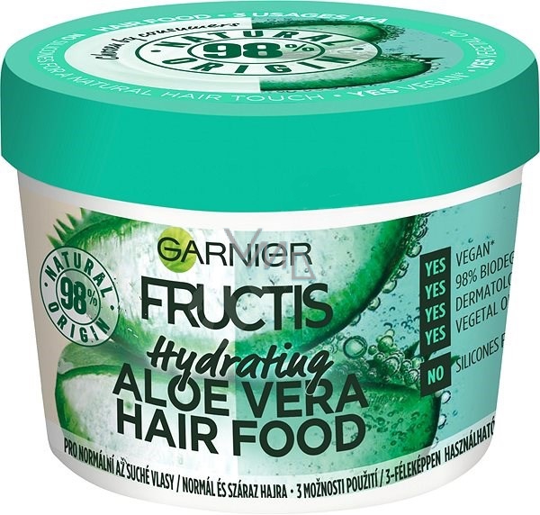 Skoncujte se suchými a nepoddajnými vlasy jednou provždy s Garnier Fructis Aloe Hair Food. Maska určená pro normální až suché vlasy Garnier Hair Food s přídavkem aloe vera a rostlinných olejů účinně a šetrně pečuje o vaše suché vlasy a navrací jim vitalitu a jemnost. Garnier Fructis Aloe obsahuje 98 % přírodních látek a je zcela bez obsahu parabenů, silikonu a umělých barviv. S maskou Hair Food poznáte sílu aloe na vlastních vlasech a získáte jemné a poddajné vlasy.