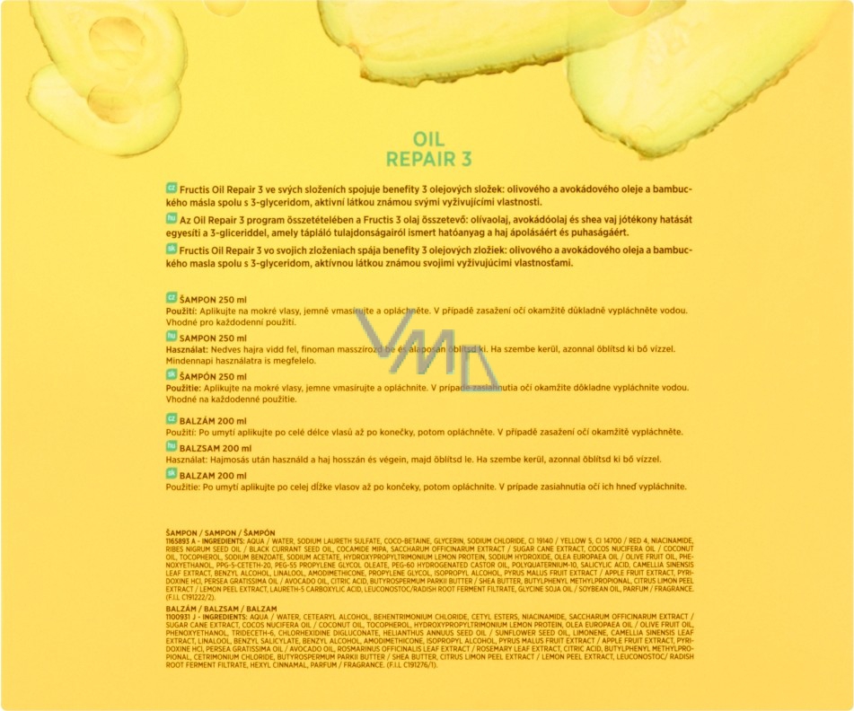 Balzám: Po umytí šamponem aplikuj balzám Fructis Oil Repair 3 na celé vlasy, zaměř se na délky a konečky. Nech působit 2 až 3 minuty a opláchni. V případě zasažení očí je okamžitě vypláchni vodou.