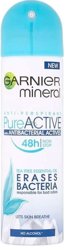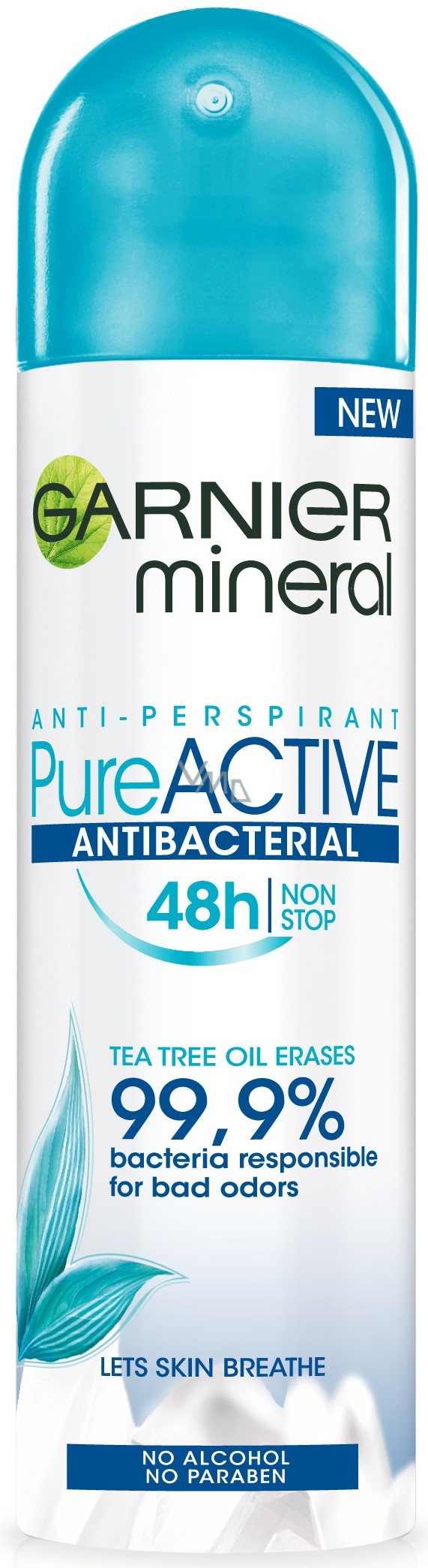 Účinný dámský antiperspirant Garnier Mineral Pure Active poskytuje spolehlivou 48hodinovou ochranu proti pocení. Díky obsahu minerálů a Tea Tree oleje s Antibakteriálními prvky dlouhodobě zamezuje vzniku vlhkosti a nepříjemnému pachu v podpaží. Mineral Pure Active ve spreji je obzvláště šetrný k jemné pokožce a zamezuje pocitu pálení. Aplikaci antibakteriálního antiperspirantu zpříjemní svěží vůně, která vydrží.