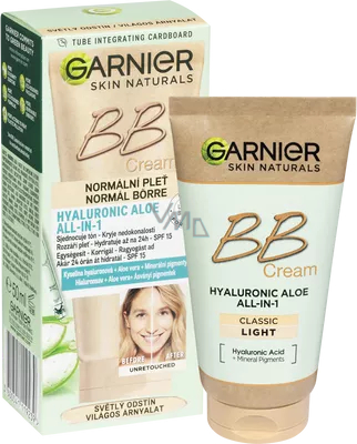 Garnier Skin Naturals BB Cream 5v1 hydratační tónovací péče světlý odstín díky kombinaci hydratačního krému a lehkého make-upu propůjčuje pokožce bleskově bezchybný vzhled. Složení s vitaminem C, minerálními pigmenty o OF 15 podporuje zdravou pleť, zanechává ji rozzářenou, sjednocenou a chrání ji před nežádoucími vlivy slunečního záření. Vyhlazený a rozzářený obličej se stane vaší součástí.