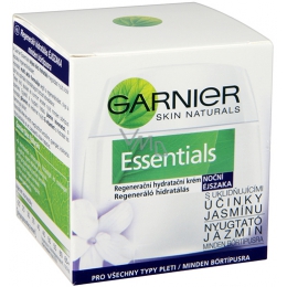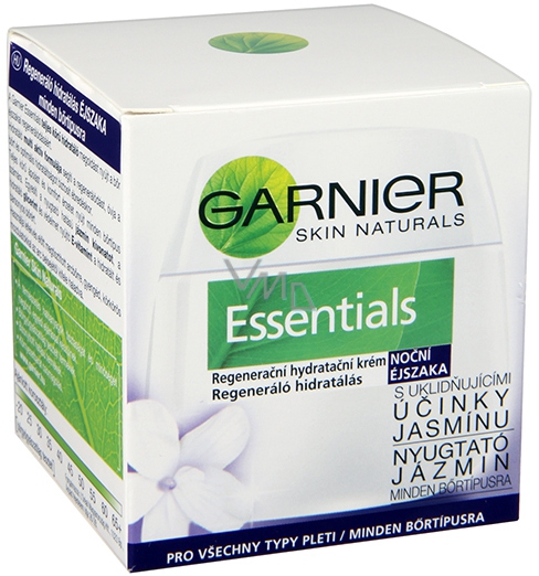 Garnier Essentials je kompletní hydratační péče, která pomáhá regenerovat Vaši pleť během spánku. Hydratační multi-aktivní složení napomáhá regeneraci a ochraně pokožky a zajišťuje optimální hydrataci Vaší pleti po probuzení. Poskytuje kompletní péči pro všechny typy pleti. Spojuje v sobě výtažky z jasmínu, známého pro své uklidňující účinky, hydratační glycerin a ochranný vitamin E. Pleť je po probuzení hydratovaná, sametová a příjemná na dotek.