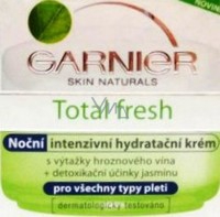 Garnier Total Fresh noční hydratační krém s výtažky hroznového vína + detoxikační účinky jasmínu je určen pro pleť, která je vystavena každodennímu působení škodlivých látek jako je: sluneční záření, znečištěné ovzduší, stres.