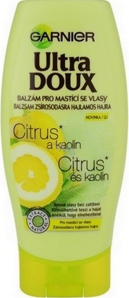 Balzám Garnier Ultra Doux představuje recept pro mastící se vlasy. Spojuje kaolin známý pro své absorpční schopnosti a citrus známý svými osvěžujícími vlastnostmi v lehké gelové textuře, která usnadňuje rozčesávání a nezatěžuje vlasy.