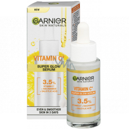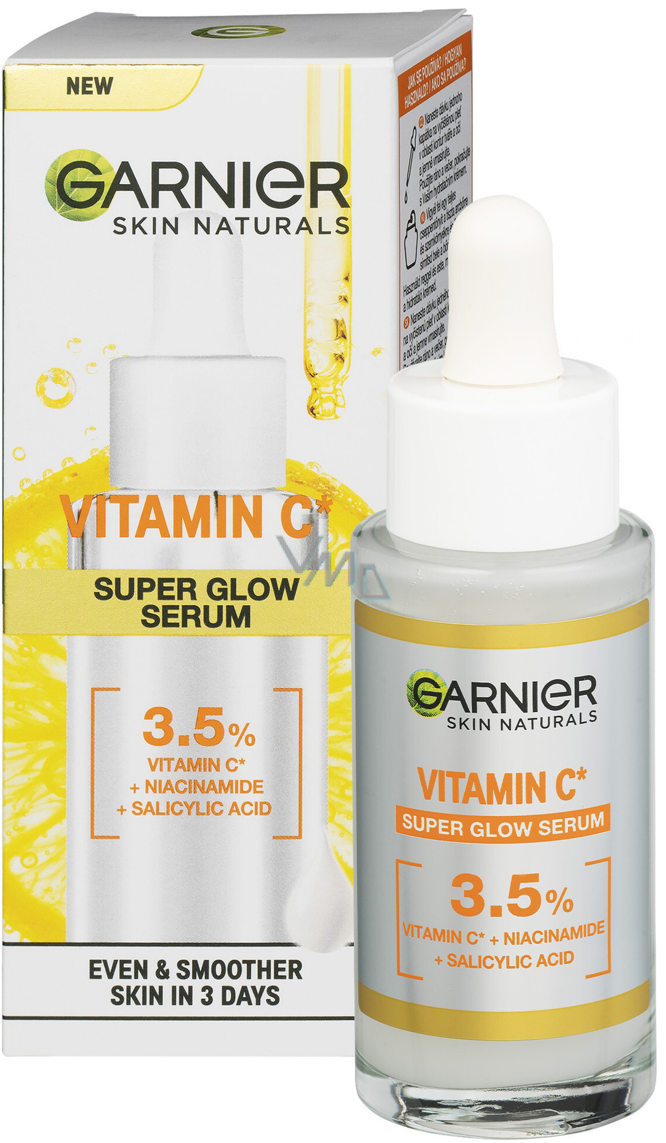 Garnier Skin Naturals pleťové sérum Vitamin C s 3,5 % komplexu látek s intenzivním efektem na pokožku – vitamin C, niacinamid a kyselina salicylová, pro snížení viditelnosti pigmentových skvrn již za 6 dní a podporu tvorby kolagenu pro hladší pleť. Výtažek z citronu má své rozjasňující a antioxidační účinky na pleť. Za 3 dny pleť se zdá více sjednocená a vypadá hladší. Za 6 dní jsou pigmentové skvrny méně viditelné.