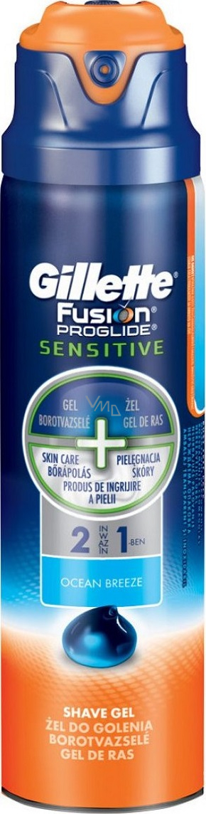 Představujeme novinku důležitou pro hladké oholení bez podráždění. Gel Sensitive Ocean Breeze je holící gel 2v1 určen pro citlivou pokožku s vůní Ocean Breeze. Je jemný jako krém, změkčuje vousy, chrání pokožku a zlepšuje skluz strojku. Gillette Fusion ProGlide Sensitive gel na holení je dermatologicky testován a dává vám neuvěřitelně hladké oholení od začátku do konce. Pro citlivou pleť.