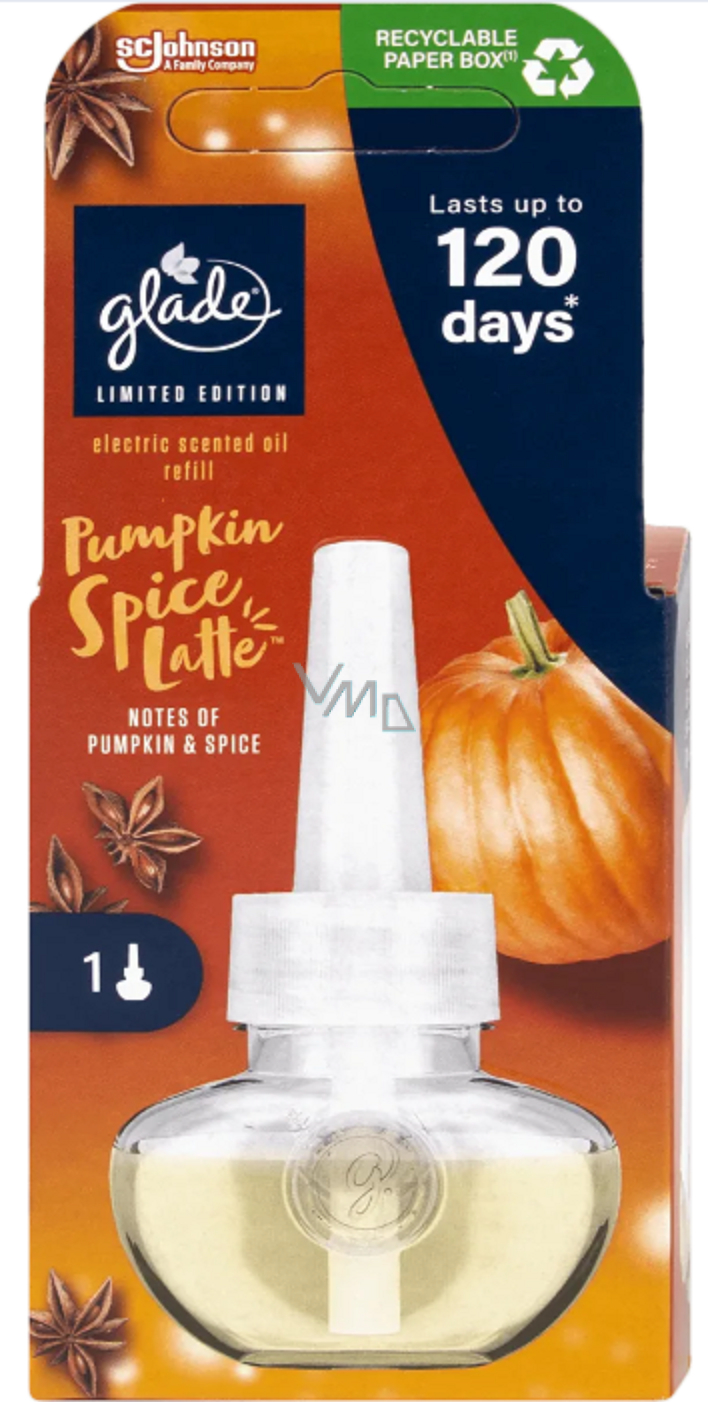 Náhradní náplň Glade do elektrického osvěžovače vzduchu Pumpkin Spice Latte s vůní čerstvě uvařeného dýňového latté. Regulovat intenzitu vůně můžete u tohoto typu osvěžovače podle vlastních potřeb. Krásně provoní každý interiér, kde se chcete cítit příjemně.