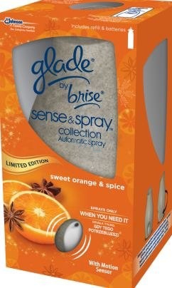 Glade by Brise Sense & Spray Collection Vůně pomaranče a koření - automatický osvěžovač vzduchu se senzorem pohybu. Lahodná směs, která obsahuje tóny šťavnatého pomeranče a mandarinky, obohacená o koření hřebíčku a vanilky. Do osvěžovače použijte originální náplň z kolekce Glade by Brise Sense & Spray.