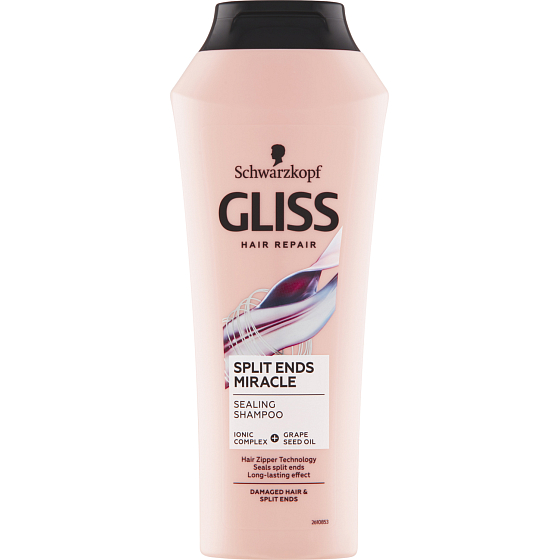 Gliss Split Ends Miracle šampon s iontovým komplexem a olejem ze semen hroznového vína pro poškozené vlasy a roztřepené konečky. Regeneruje a čistí vlasy.