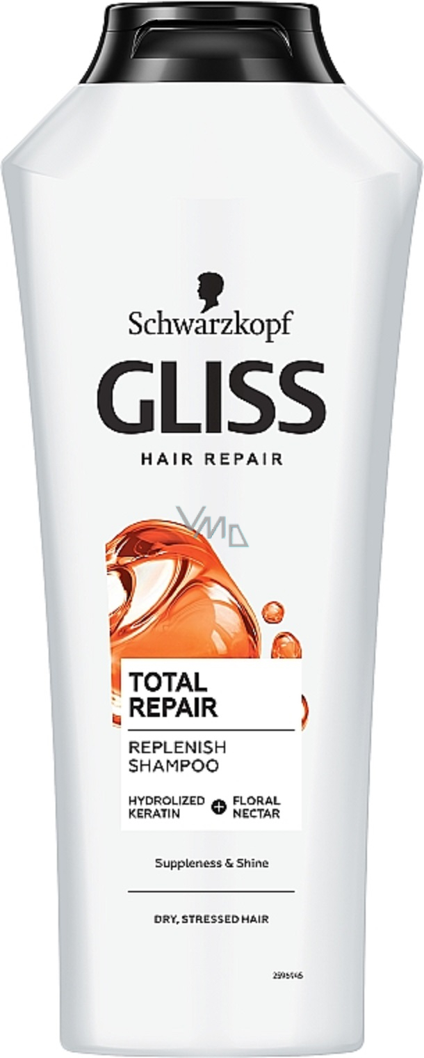 Szampon do suchych i zniszczonych włosów. Formuła z aktywnymi składnikami i kompleksu płynnego keratyny głęboko regeneruje włosy, co prowadzi do 85% mniejszej łamliwości włosów oraz elastycznych, zdrowo lśniących włosów. Gliss Kur Total Repair oferuje połączenie skutecznych składników, białek i witamin, które razem tworzą wyjątkowo skuteczną formułę pielęgnacyjną dla kompleksowej regeneracji włosów.