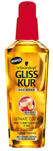 Nový přírůstek řady Gliss Kur elixír s oleji Ultimate Color představuje první olejovou kúru značky Gliss Kur pro barvené vlasy. Dodává vlasům zářivý lesk, hebkost i jemnost, fixuje barvu a pečuje o vlasová vlákna, aniž by vlasy zatěžoval. Díky třem různým možnostem aplikace se tento produkt stává základním pečujícím přípravkem pro barvené vlasy.