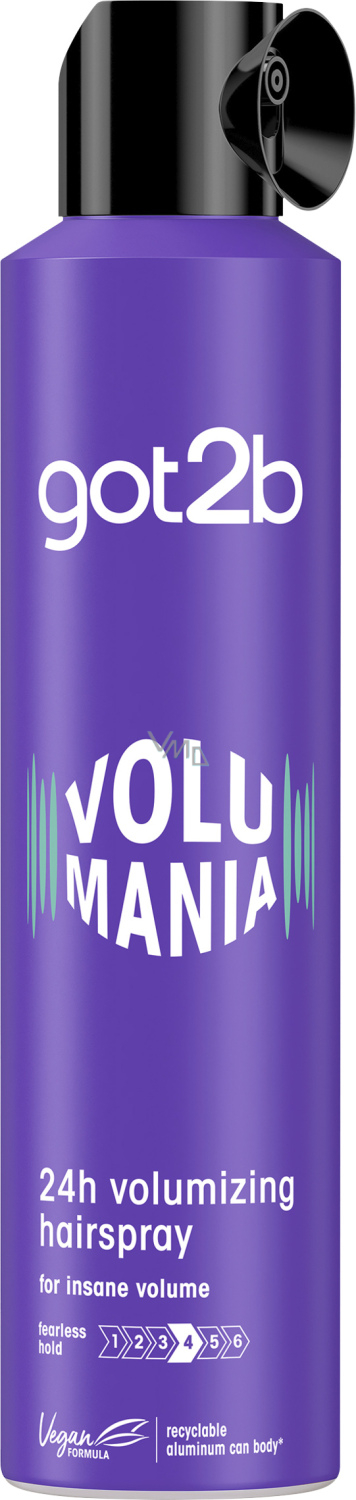 Got2b Volumania 24h objemový lak na vlasy - pro niewiarygodny objem. Pocznij objem svého účesu do výšin! Got2b objemový lak na vlasy dodává objem od kořínků po konečky. Fixuje objem vlasů až na 24 hodin, aniž by je zatěžoval. Pro pocit nawilżonych włosów z nieustraszoną fixacją. Skład jest wegański*. Aluminiowe ciało puszki jest recyklingowalne **