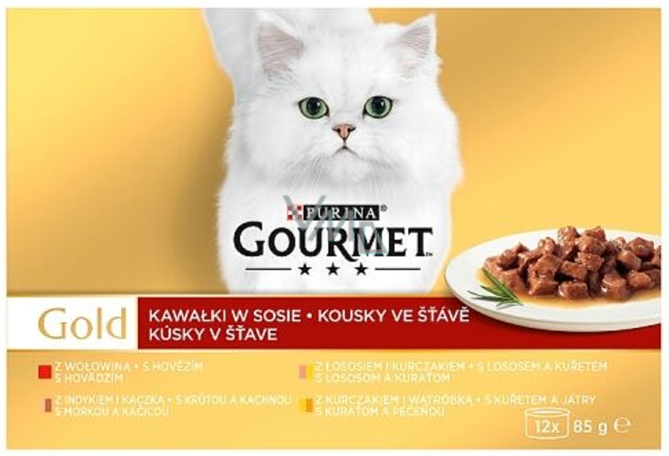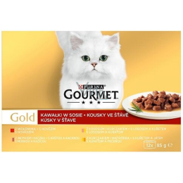 Puszkowane jedzenie dla kotów Gourmet Gold to wysokiej jakości karma dla kotów. Zawiera jedną porcję (śniadanie, obiad i kolacja). Wybierz Gourmet Gold i raz na zawsze pozbądź się otwartych, niedojedzonych lub zapomnianych puszek w lodówce, których wyschniętą zawartość Twój kot nie chce jeść. Mięsiste kawałki wyglądają jak mięso prasowane w kawałki, w których widoczne są włókna mięśniowe. Wysokiej jakości składniki i przetwarzanie, a także doskonały smak plasują te puszki na czołowych pozycjach popularności wśród hodowców kotów. Jeśli Twój kot przyzwyczai się do Gourmet Gold, bardzo niechętnie będzie chciał przejść na inną markę puszek dla kotów.