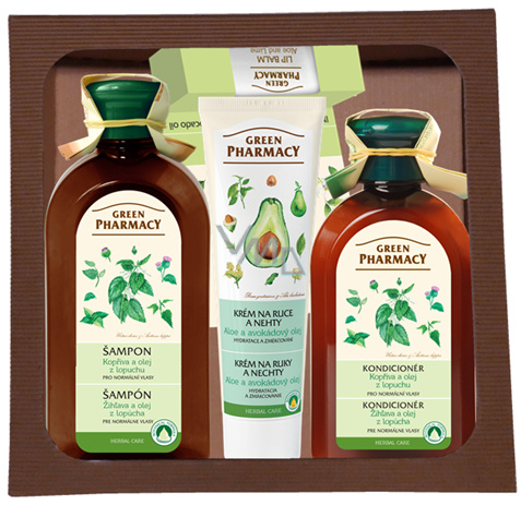 Green Pharmacy Kopřiva a Olej z kořenů lopuchu šampon pro normální vlasy 350 ml pro ženy + kondicionér na vlasy 300 ml + Aloe a avokádový olej hydratační krém na ruce a nehty 100 ml + balzám na rty 3,6 g, kosmetická sada