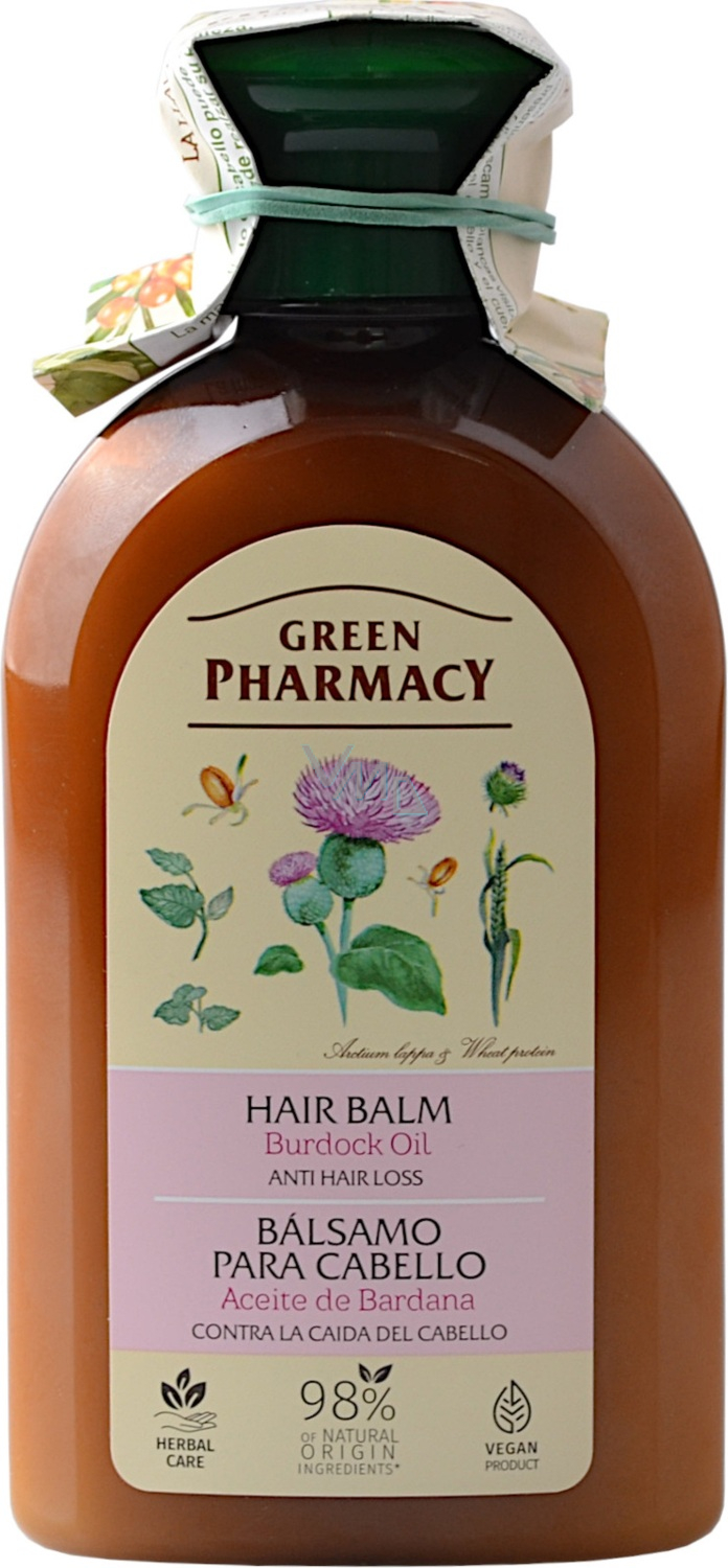 Green Pharmacy odżywka przeciw wypadaniu włosów z łopianem i pszenicą jest przeznaczona do pielęgnacji osłabionych włosów ze skłonnością do wypadania. Ekstrakt z korzenia łopianu wspomaga ukrwienie skóry głowy, wzmacnia cebulki włosów i stymuluje ich wzrost. Proteiny pszeniczne intensywnie odżywiają, nawilżają i poprawiają elastyczność oraz połysk włosów.