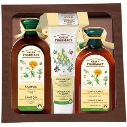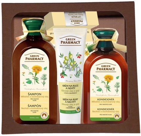 Green Pharmacy Měsíček a Rozmarýnový olej šampon pro mastné vlasy 350 ml + kondicionér na mastné vlasy 300 ml + Olivový olej a goji krém na ruce 100 ml + Aloe a limetka balzám na rty 3,6 g, kosmetická sada