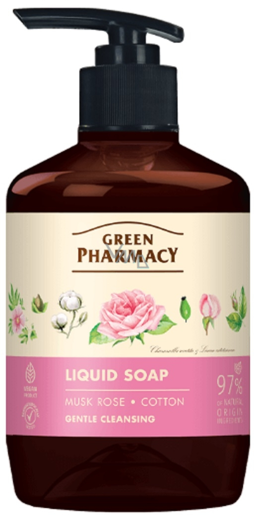 Green Pharmacy piżmowa róża i bawełna - płynne kremowe mydło do zachowania młodej skóry. Delikatnie czyści i nawilża skórę dzięki róży, olejowi arganowemu i ekstraktowi z bawełny. Orzeźwia i dodaje skórze witalności.
