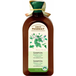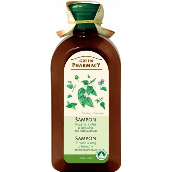 Green Pharmacy szampon do normalnych włosów z pokrzywą i łopianem delikatnie oczyszcza włosy i skórę głowy, jednocześnie dostarczając im składników odżywczych i naturalnego blasku. Ekstrakt z liści pokrzywy pomaga wzmacniać włosy, wspiera ich zdrowy wzrost i ogranicza powstawanie łupieżu. Ekstrakt z korzenia łopianu stymuluje skórę głowy i wzmacnia cebulki włosów.
