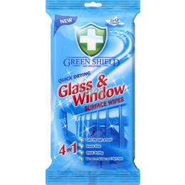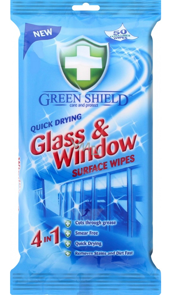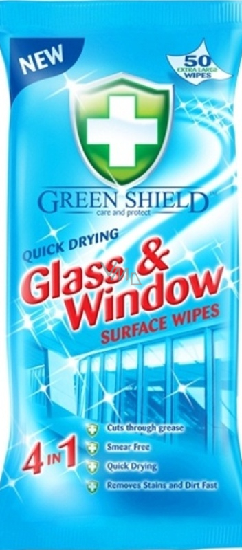 Green Shield úklidové vlhčené ubrousky na sklo, jsou určené na skleněné povrchy a sklo. Vlhčené ubrousky jsou rychleschnoucí a nezanechávají skvrny. Z povrchů odstraňují nečistoty a mastnotu.