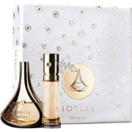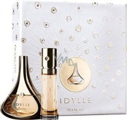Vůně Idylle Guerlain přichází v tomto krásném zlatém flakónku, připomínající kapku deště. Idylle odhaluje lektvar lásky, který je velice sexy a moderní. Sprcha růží, lilií a pivoněk okořeněná trochou pačuli a svůdným pižmem. V dárkovém balení v provedení EdP s praktickou kabelkovou lahvičkou jako dárek pro náročnou ženu.