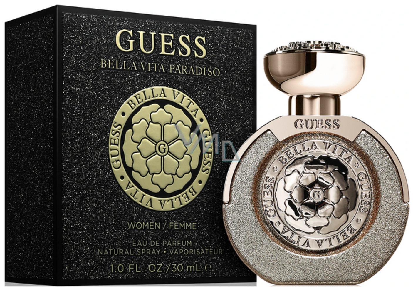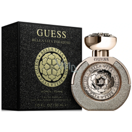 Zapach dla kobiet Guess Bella Vita Paradiso rozszerza popularną linię zapachów Bella Vita. Świętuje pewność siebie i zmysłowość kobiety swoim olśniewająco złotym blaskiem. Jest inspirowany boskim pięknem połyskującej włoskiej krainy doskonałości. Jego zapach jest kulinarny, kwiatowo-bursztynowy.