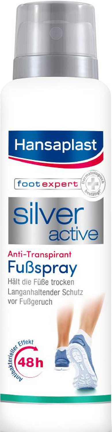 Hansaplast spray na stopy SILVER ACTIVE zapewnia aktywną ochronę przed potem, dzięki zawartości jonów srebra. Spray jest bezalkoholowy, ma przyjemny i świeży zapach, nie podrażnia skóry. Można go stosować również do butów.