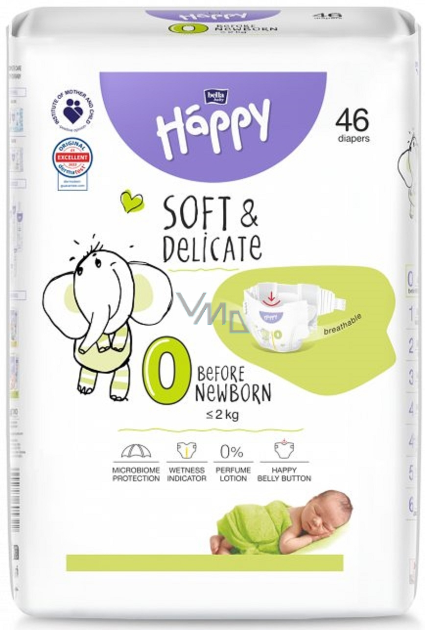 Pieluchy dziecięce Happy Soft & Delicate Before Newborn są zalecane dla noworodków o wadze do 2 kg. Są wykonane z wysokiej jakości materiałów, doskonale dopasowują się do ciała dziecka i zapewniają przyjemne uczucie suchości. Są zaprojektowane tak, aby spełniać potrzeby najbardziej wrażliwej skóry. Nie zawierają żadnych alergenów i minimalizują ryzyko powstawania odparzeń. Te pieluchy mają w przedniej części specjalny wycięcie na pępek, które zapewnia dostęp powietrza do pępka, przyspieszając w ten sposób proces gojenia.