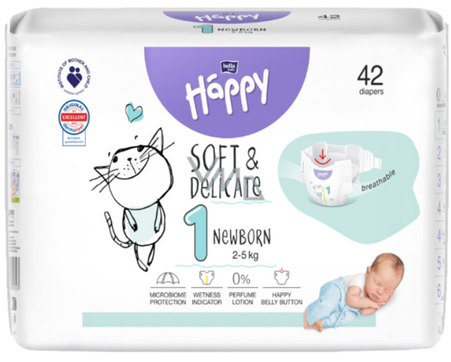 Pieluszki dziecięce Happy Soft & Delicate Newborn (1) są zalecane dla noworodków o wadze 2-5 kg. Są wykonane z najwyższej jakości materiałów, doskonale dopasowują się do ciała dziecka i zapewniają przyjemne uczucie suchości. Zostały zaprojektowane tak, aby odpowiadały potrzebom tej najwrażliwszej skóry – nie zawierają żadnych alergenów i minimalizują ryzyko powstawania odparzeń.