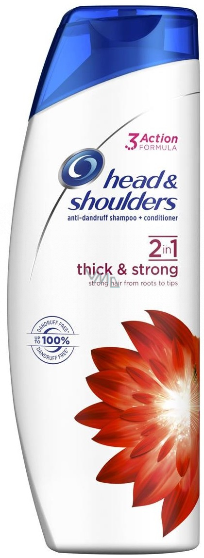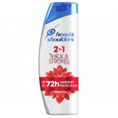 Head & Shoulders Šampon a balzám na vlasy proti lupům 2v1 bojuje proti příčinám vzniku lupů pro až 72hodinovou ochranu proti lupům, svědivosti a suché pokožce hlavy (viditelné lupy, při pravidelném používání; svědivost v důsledku výskytu lupů). Jeho pokrokové složení s vyváženým pH a posílené antioxidanty je dermatologicky testované pro šetrnou péči o vlasy a pokožku hlavy a poskytuje vlasy až 100% bez lupů, klinicky ověřené (při pravidelném používání). Šampon a balzám proti lupům Thick & Strong pomáhá posilovat vlasy a obnovovat jejich pevnost od kořínků až po konečky (proti poškození a lámavosti způsobené česáním). Head & Shoulders je světová jednička mezi značkami šamponů (na základě výpočtu společnosti P&G založeném na údajích o ročních prodejích šamponů), která se stará o planetu: Recyklovatelná lahev (s výjimkou víčka a v závislosti na vybavení recyklační továrny).