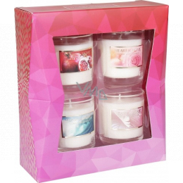Sada obsahuje 4 svíčky v jarních vůních - Granátové jablko, Mořský vánek, Dotek anděla, Růže a maliny.