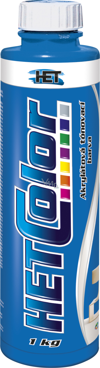 Hetcolor akrylátová tónovací barva k tónování fasádních a vnitřních disperzních i klasických nátěrů nebo k přímé aplikaci. Disperzní tónovací matná barva pro vnitřní i venkovní použití. K tónování vodou-ředitelných disperzních i klasických barev určených k nátěrům stěn a stropů nebo k přímé aplikaci na vnitřní i venkovní vápenné, vápenocementové omítky, omítky s akrylátovým pojivem, zdivo apod. Lze použít i k dekoračním nátěrům svislých betonových konstrukcí. V případě podkladů nevystavených působení srážkové vody a aplikací v interiéru lze barvu použít k dekorativním nátěrům dřevotřískových, dřevovláknitých, sádrokartonových či sádrovláknitých desek, sádrových nebo sádrovápenných omítek, papíru, tapet atd.