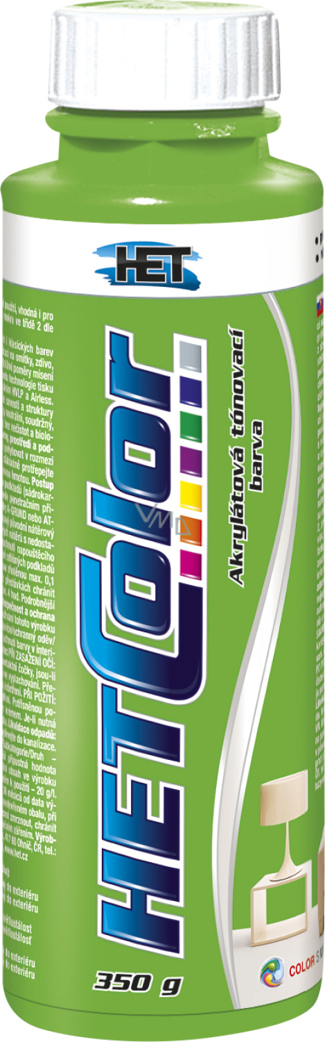 Hetcolor akrylátová tónovací barva k tónování fasádních a vnitřních disperzních i klasických nátěrů nebo k přímé aplikaci. Disperzní tónovací matná barva pro vnitřní i venkovní použití. K tónování vodou-ředitelných disperzních i klasických barev určených k nátěrům stěn a stropů nebo k přímé aplikaci na vnitřní i venkovní vápenné, vápenocementové omítky, omítky s akrylátovým pojivem, zdivo apod. Lze použít i k dekoračním nátěrům svislých betonových konstrukcí. V případě podkladů nevystavených působení srážkové vody a aplikací v interiéru lze barvu použít k dekorativním nátěrům dřevotřískových, dřevovláknitých, sádrokartonových či sádrovláknitých desek, sádrových nebo sádrovápenných omítek, papíru, tapet atd.