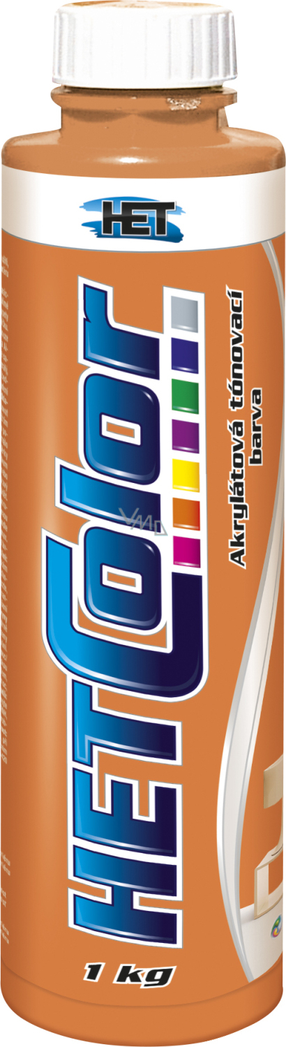 Hetcolor akrylátová tónovací barva k tónování fasádních a vnitřních disperzních i klasických nátěrů nebo k přímé aplikaci. Disperzní tónovací matná barva pro vnitřní i venkovní použití. K tónování vodou-ředitelných disperzních i klasických barev určených k nátěrům stěn a stropů nebo k přímé aplikaci na vnitřní i venkovní vápenné, vápenocementové omítky, omítky s akrylátovým pojivem, zdivo apod. Lze použít i k dekoračním nátěrům svislých betonových konstrukcí. V případě podkladů nevystavených působení srážkové vody a aplikací v interiéru lze barvu použít k dekorativním nátěrům dřevotřískových, dřevovláknitých, sádrokartonových či sádrovláknitých desek, sádrových nebo sádrovápenných omítek, papíru, tapet atd.