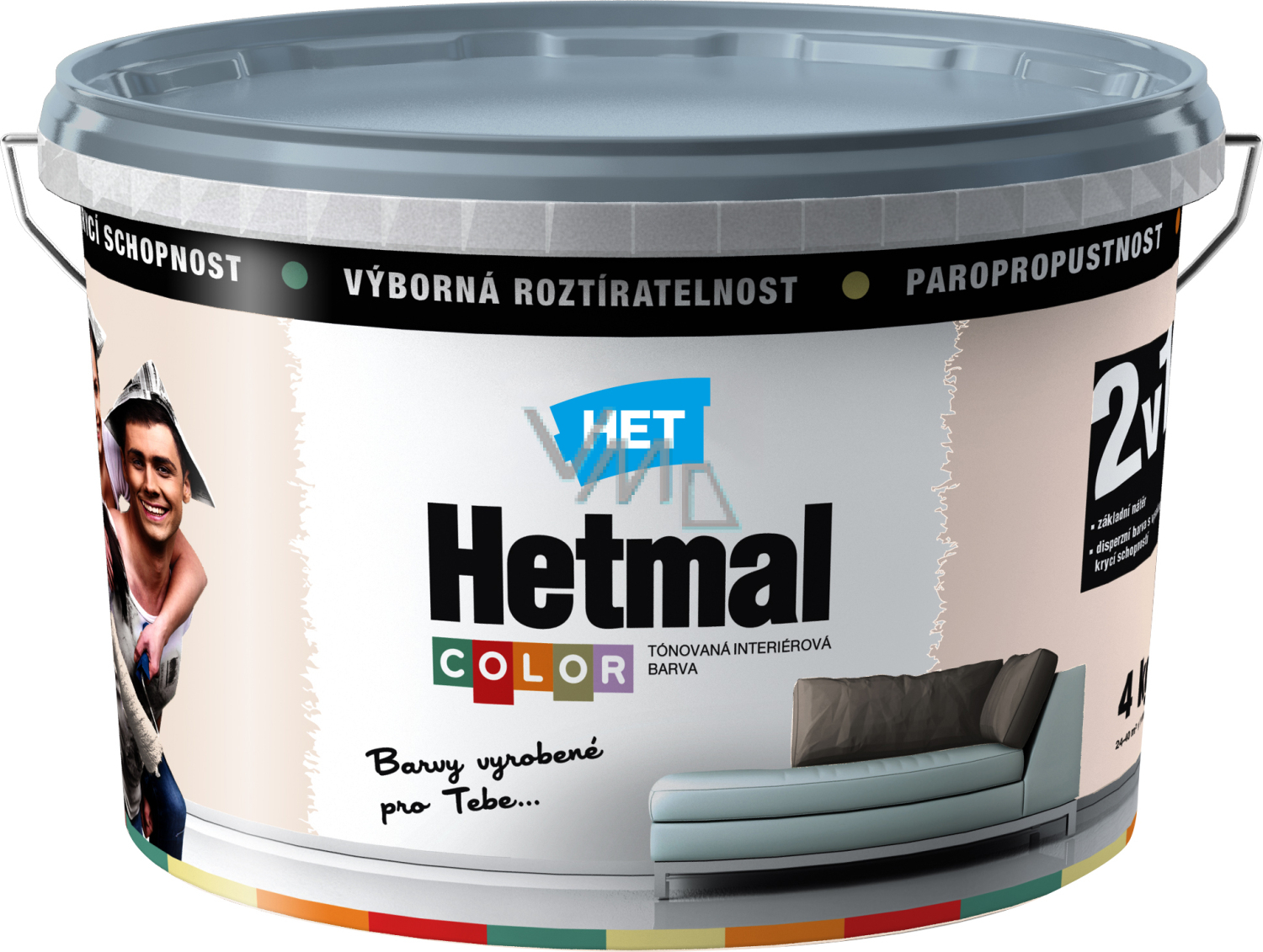 Wewnętrzna dyspersyjna biała farba kryjąca Het Hetmal Plus o wysokiej zdolności kryjącej - zalecana do przestrzeni komercyjnych i mieszkalnych, biur, szkół, korytarzy, zastosowań przemysłowych. Het Hetmal Plus jest przeznaczona do wewnętrznych powłok ścian i sufitów, tynków wapiennych i wapienno-cementowych, paneli betonowych i monolitów, tapet papierowych do tego przeznaczonych, itp. Farba nadaje się do malowania starych nośnych warstw farb wewnętrznych. Produkt spełnia wymagania dla powłok powierzchni, które mogą mieć kontakt z żywnością w sposób pośredni i bezpośredni przypadkowy. Malowanie tworzy matową, paroprzepuszczalną powierzchnię, która jest odporna na standardową wilgotność w pomieszczeniach i odporną na ścieranie suchą tkaniną. Pokryta powierzchnia nie może być w stałym kontakcie z wodą i nie może być narażona na skondensowaną wilgoć. Wyschnięta powłoka krótko odporna jest na temperatury do około 70 °C. Farba Het Hetmal Plus jest odpowiednia do malowania pomieszczeń mieszkalnych i komercyjnych, korytarzy, biur, szkół, przestrzeni przemysłowych itp. Zwiększona biel 93 % (MgO), wysoka wydajność, matowy wygląd, odporność na ścieranie za sucho, paroprzepuszczalność, łatwa do tonowania
