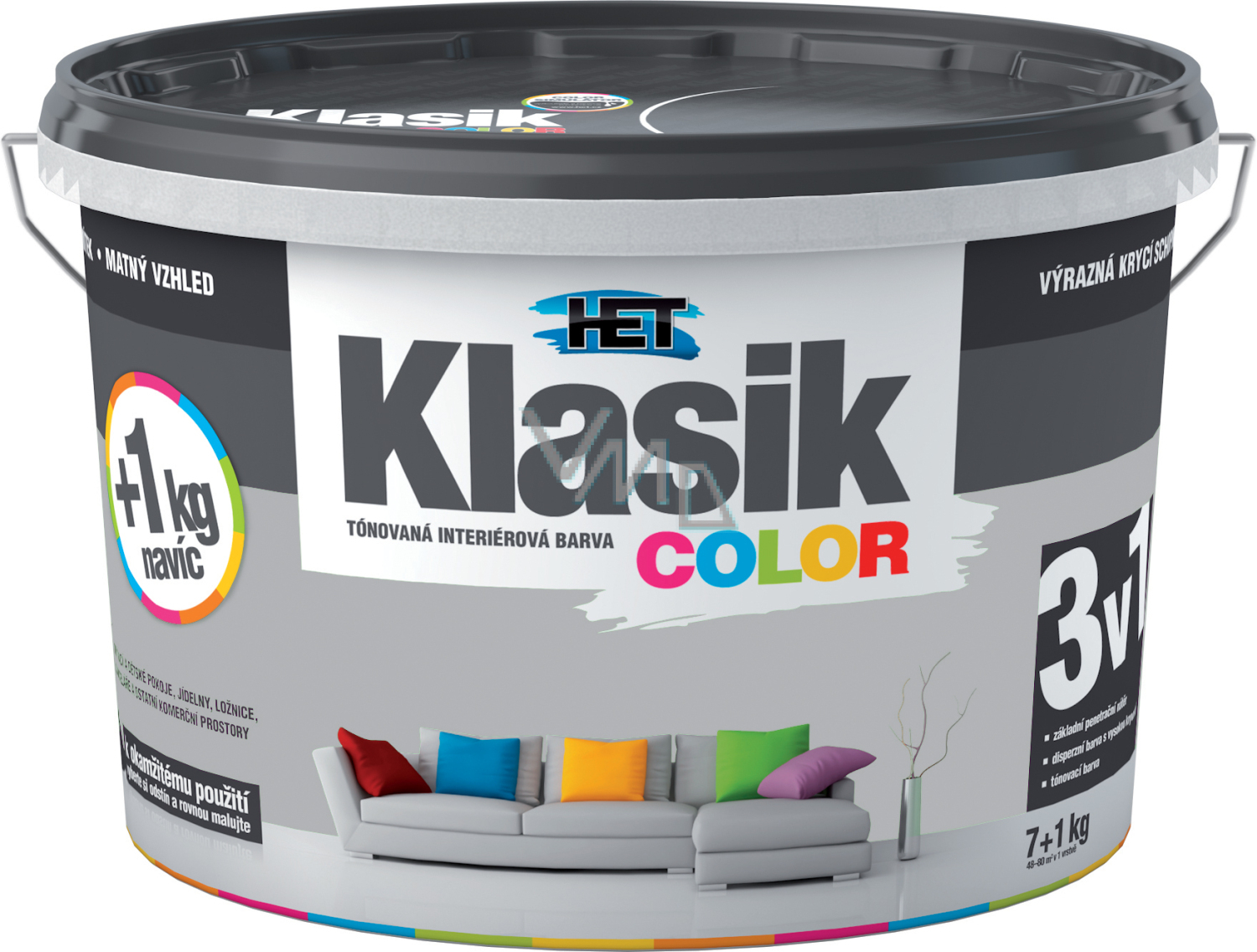 Het Klasic Color malířská tónovaná disperzní otěruvzdorná barva kterou doporučujeme pro obývací a komerční prostory, dětské pokoje, jídelny, chodby, kanceláře, prodejní prostory. Vhodná k nátěrům minerálních, sádrových a sanačních omítek, zdiva, betonových panelů a monolitů, sádrokartonových, sádrovláknitých a dřevovláknitých desek, papírových tapet k tomu určených, tapet ze skelných vláken apod.