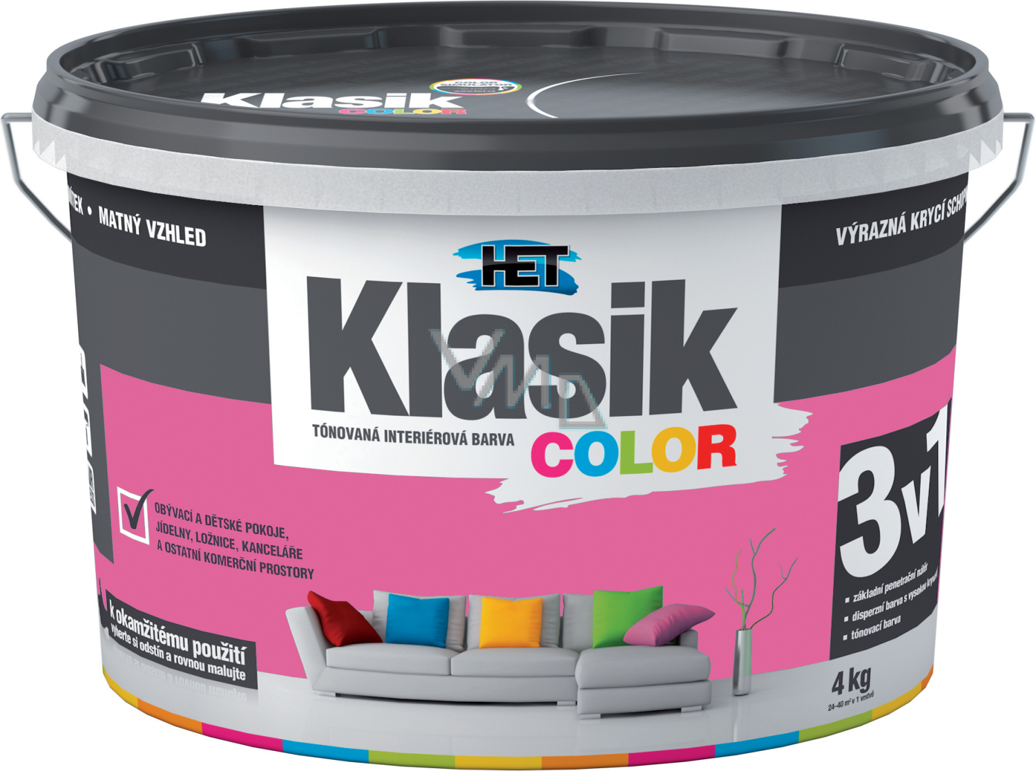 Het Klasic Color farba malarska tonowana dyspersyjna odporna na ścieranie którą rekomendujemy do pomieszczeń mieszkalnych i komercyjnych, pokojów dziecięcych, jadalni, korytarzy, biur, przestrzeni sprzedażowych. Odpowiednia do malowania tynków mineralnych, gipsowych i renowacyjnych, murów, paneli betonowych i monolitów, płyt gipsowo-kartonowych, gipsowo-włóknistych i drewnopochodnych, tapet papierowych przeznaczonych do tego celu, tapet z włókna szklanego itp.