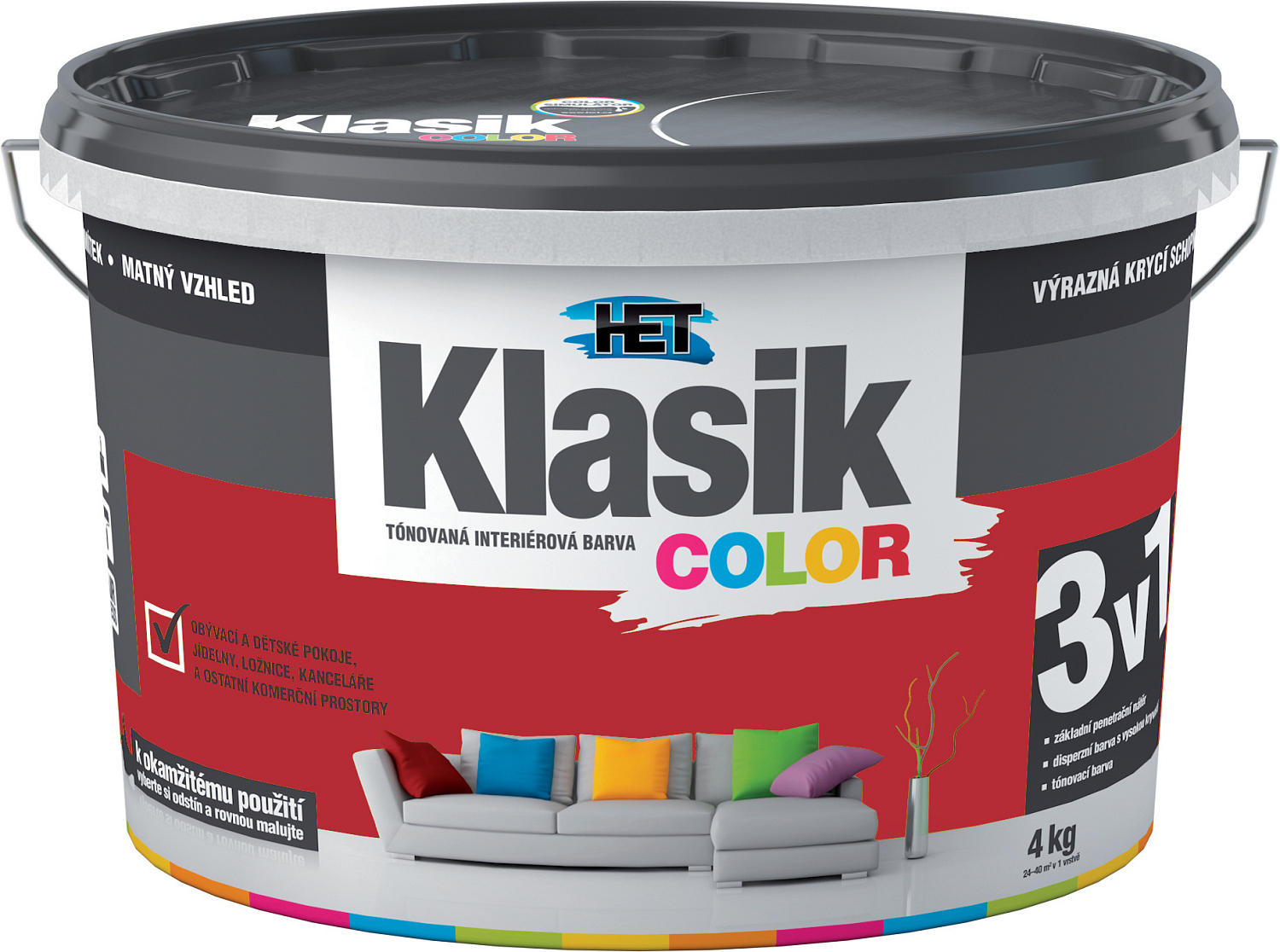 Het Klasic Color farba malarska w odcieniu dyspersyjnym odpornym na ścieranie polecana do pomieszczeń mieszkalnych i komercyjnych, pokojów dziecięcych, jadalni, korytarzy, biur, przestrzeni handlowych. Odpowiednia do malowania tynków mineralnych, gipsowych i renowacyjnych, murów, paneli betonowych i monolitycznych, płyt z kartonu gipsowego, płyt gipsowo-włóknistych i drewnopochodnych, tapet papierowych do tego przeznaczonych, tapet z włókna szklanego itp.