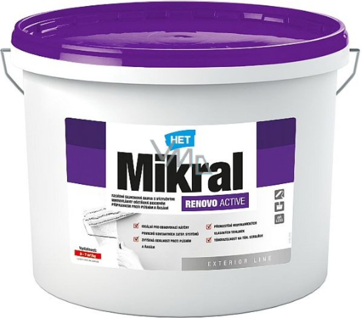 Het Mikral Renovo Active to najwyższej jakości silikonowa farba elewacyjna, odpowiednia do nowych i remontowanych elewacji, w tym systemów ociepleń kontaktowych (ETICS). Dzięki zawartym mikrowłóknom potrafi zniwelować drobne pęknięcia w podłożu oraz chronić powierzchnię przed wilgocią, zanieczyszczeniami oraz wzrostem glonów i pleśni.