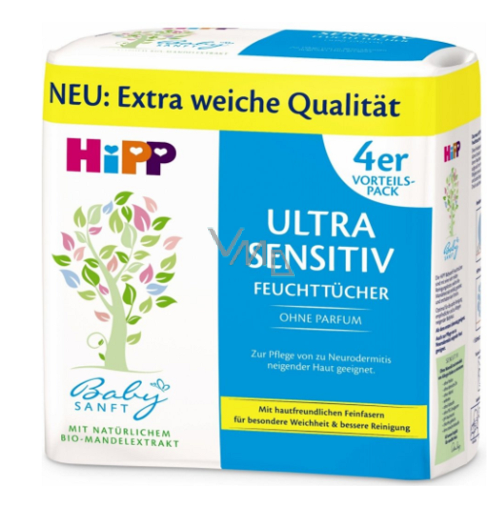 Hypoalergenní čistící vlhčené ubrousky HiPP Babysanft Ultra Sensitive jsou určeny pro děti s velmi citlivou pokožkou i pro děti se sklonem k atopické dermatitidě. Obsažené jemné pleťové mléko s výtažkem z BIO mandlí je velmi šetrné k citlivé dětské pokožce a redukuje riziko vzniku alergií. Vyznačují se velmi jemnou texturou, která umožňuje mimořádně šetrné očištění pokožky díky své vysoké absorpční schopnosti a bez nutnosti vyvíjet tlak. Ubrousky lze bez obav použít na celé tělíčko dítěte včetně obličeje, protože mají neutrální pH a nejsou mastné. Ubrousky neobsahují alkohol, éterické oleje, mýdlo, barviva, PEG emulgátory ani parabeny.