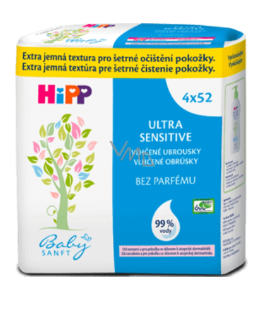HiPP Ultra Sensitiv čisticí vlhčené ubrousky mají obzvlášť jemnou texturu, vysokou absorpční schopnost a jsou napuštěny jemným pleťovým mlékem s výtažkem z bio mandlí, díky tomu mimořádně šetrně čistí pokožku v oblasti plenek, aniž byste museli vyvíjet tlak. HiPP Babysanft čisticí vlhčené ubrousky Ultra Sensitiv jsou vhodné k čistění citlivé dětské pokožky a pokožky se sklonem k alergiím v oblasti obličeje i rukou. Vhodné pro jemné očištění citlivé dětské pokožky a pokožky se sklonem k alergiím. Snášenlivost s pokožkou dermatologicky testována. Vhodné pro pokožku se sklonem a atopické dermatitidě. Uchovávejte mimo dosah dětí, aby nedošlo k případnému vdechnutí nebo udušení. Pouze pro vnější použití.