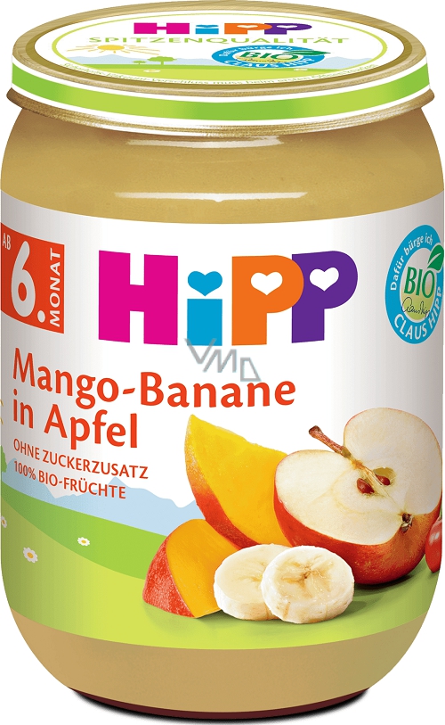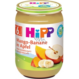 HiPP Bio ovocný příkrm s jablky, mangem a banány je vhodný pro děti od 6 měsíců. Příkrm je bez lepku, bez mléčné složky, cukrů, aromat, barviv, konzervačních látek a zahušťovadel. Výrobek je vhodný pro děti od 6 měsíců.