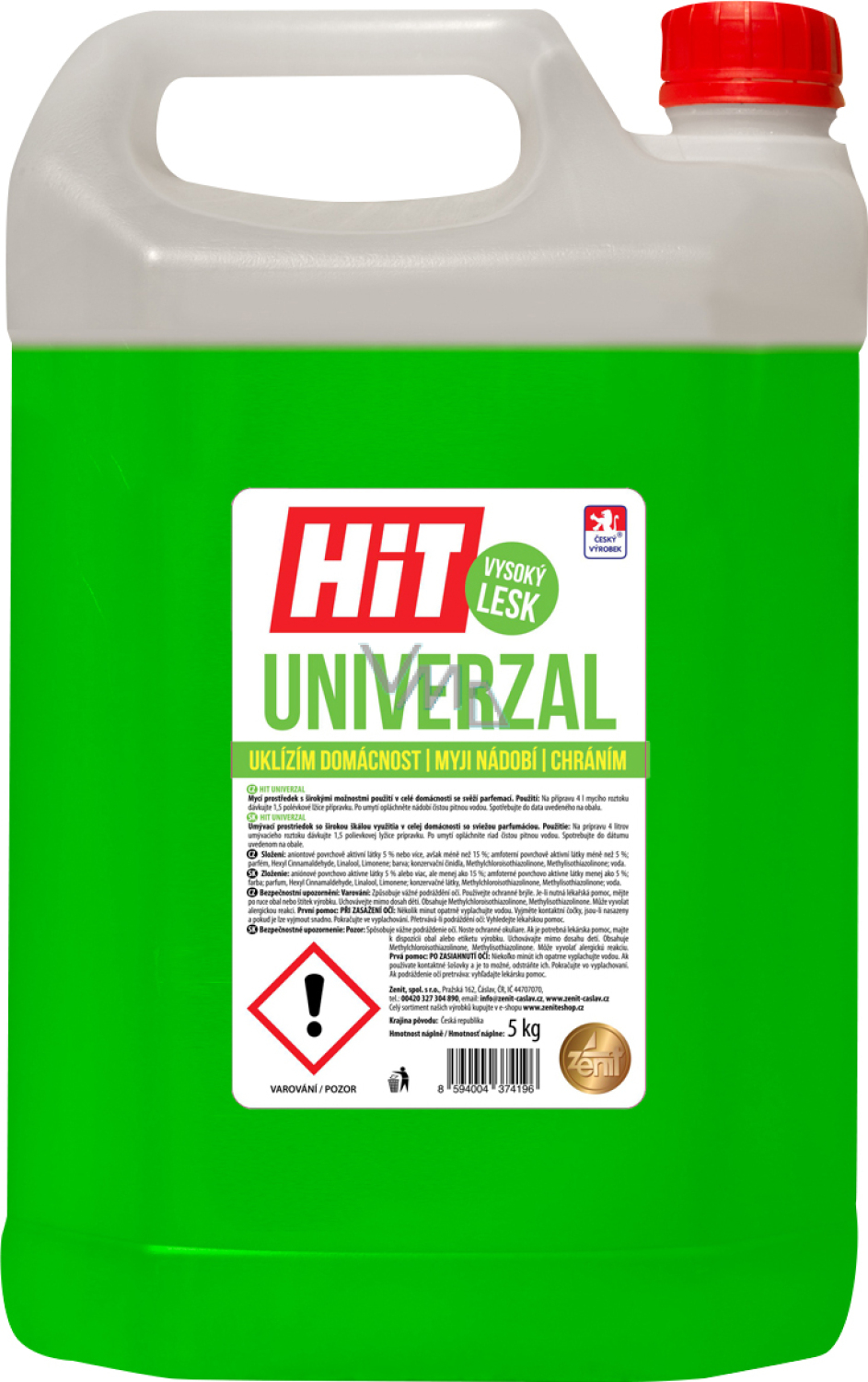 HIT uniwersalny środek czyszczący z szerokimi możliwością zastosowania w całym domu. Ze względu na swoją jakość jest wykorzystywany także przez profesjonalne firmy sprzątające. Nadaje się do naczyń i wszystkich zmywalnych powierzchni, takich jak szkło, parapety i ramy okien, meble plastikowe, podłogi, płytki itp. Pozostawia powierzchnie błyszczące i bez smug. Z przyjemnym, świeżym zapachem.