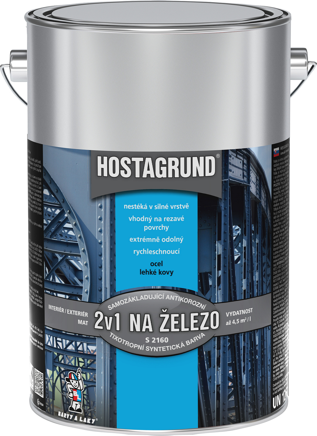 HOSTAGRUND 2v1 NA ŻELAZO S2160 jest podstawową i wierzchnią powłoką syntetyczną na żelazo. Przeznaczony do wykonywania jednowarstwowych powłok zewnętrznych konstrukcji stalowych, np. masztów, mostów, podwozi, ogrodzeń, narażonych na bezpośrednie działanie czynników atmosferycznych. Nadaje się również do malowania lekki metali, np. blach ocynkowanych. Farba ma doskonałą przyczepność do powierzchni stalowych i bardzo szybkie schnięcie, nawet w grubych warstwach. Charakterystyka tiksotropowa pozwala na nakładanie farby w bardzo grubych warstwach, za pomocą natrysku wysokociśnieniowego można nałożyć do 300 µm mokrego filmu. Farba może być również stosowana do malowania podłoży chłonnych, takich jak drewno czy mur. Film malarski ma jedwabisty matowy powierzchnię. Jest produkowany w szerokiej gamie kolorów (dla odbiorców hurtowych również w odcieniach RAL).