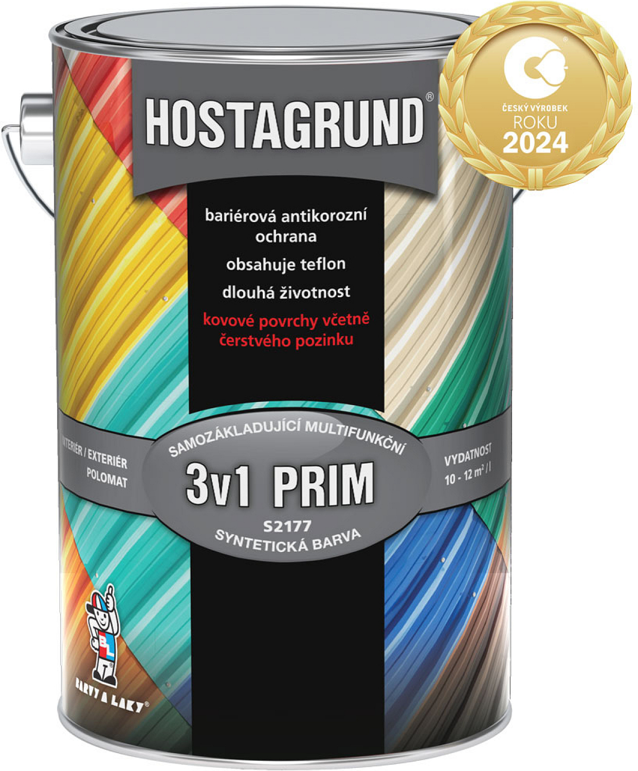 Jednowarstwowa półmatowa farba łącząca właściwości podkładowej powłoki antykorozyjnej, warstwy pośredniej oraz jednocześnie farby wierzchniej. Przeznaczona do bezpośredniego malowania metali w środowisku zewnętrznym i wewnętrznym. Farba na metal jest idealna do malowania materiałów stalowych, utlenionych i świeżo ocynkowanych powierzchni, takich jak np. dachy, konstrukcje metalowe, maszty, ogrodzenia, słupy, bramy itp. Farba na metal może być również stosowana do malowania nasiąkliwych podłoży, takich jak np. drewno i płyta wiórowa. Teflon zawarty w farbie tworzy na powierzchni powłoki warstwę odporną na zwilżanie, która zapobiega osadzaniu się brudu, opadów z powietrza i wody na pomalowanej powierzchni. Dlatego powłoka HOSTAGRUND 3w1 PRIM wykazuje długą trwałość, doskonałą odporność na warunki atmosferyczne i idealną ochronę barierową. Jest dostępna w szerokiej gamie odcieni, a dla tych, którzy preferują indywidualny kolor, dostępna jest jej baza tonująca, umożliwiająca realizację kolejnych 5 tysięcy odcieni.