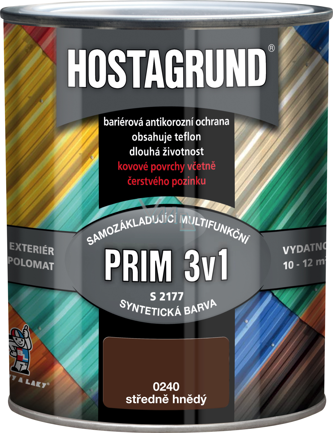 Jednowarstwowa farba półmatowa łącząca właściwości podkładu antykorozyjnego, warstwy pośredniej oraz jednocześnie wierzchniej farby. Jest przeznaczona do bezpośrednich malowań metali w środowisku zewnętrznym i wewnętrznym. Farba na metal jest idealna do malowania materiałów stalowych, utlenionych oraz świeżo ocynkowanych powierzchni, takich jak np. dachy, konstrukcje metalowe, maszty, ogrodzenia, słupy, bramy itp. Farba na metal może być również stosowana do malowania porowatych podłoży, takich jak np. drewno i płyta wiórowa. Teflon zawarty w farbie tworzy na powierzchni powłoki warstwę, która nie zatyka, dzięki czemu brud, opady z powietrza i woda nie przylegają do natryskowanej powierzchni. Dlatego powłoka HOSTAGRUND 3v1 PRIM wykazuje długą żywotność, doskonałą odporność na warunki atmosferyczne i doskonałą ochronę barierową. Jest dostępny w szerokiej gamie odcieni, a dla tych, którzy preferują indywidualny kolor, dostępna jest jego baza barwiąca do realizacji kolejnych 5 tysięcy odcieni.
