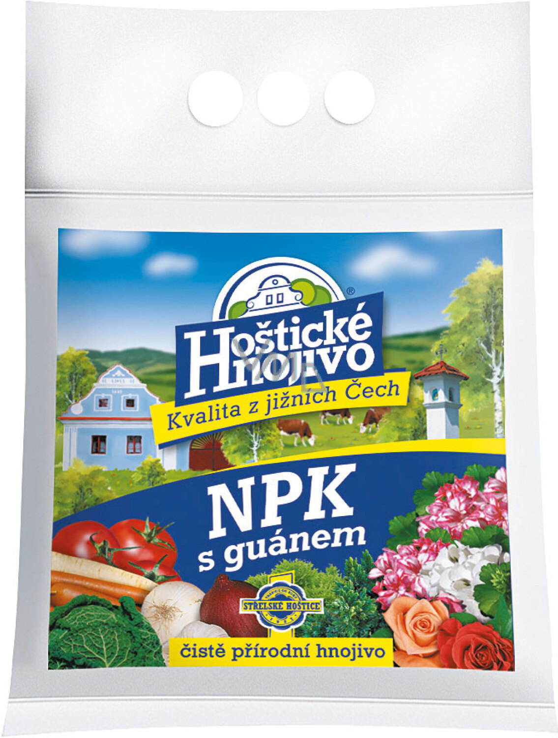 Hoštické hnojivo NPK s guánem je čistě přírodní organické hnojivo bez přídavku průmyslově vyráběných složek. Obsahuje základní živiny NPK (5% N, 2% P₂O₅, 8% K₂O) a přírodní guáno pocházející z trusu mořských ptáků, což zajišťuje bohatý obsah stopových prvků.