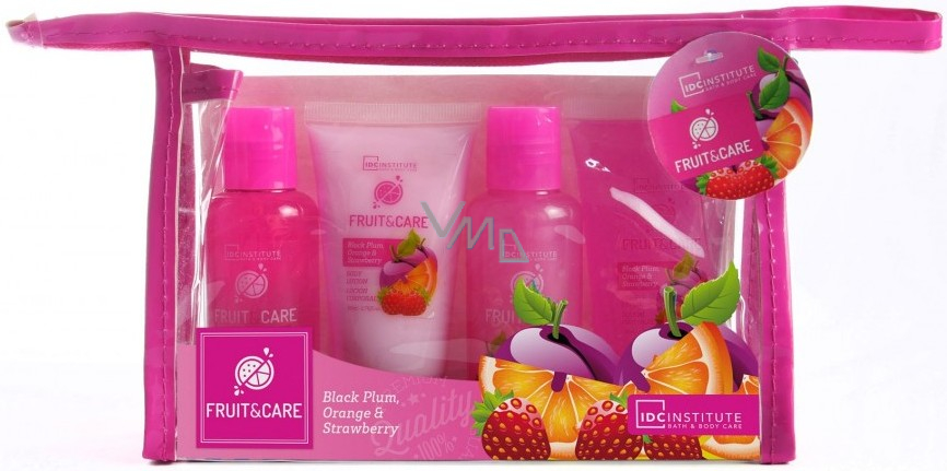 Idc Institute Fruit & Care Black Plum, Orange a Strawberry Cestovní set sprchový gel 70 ml + šampon 70 ml + tělové mléko 50 ml + peeling 50 ml + etue, kosmetická sada